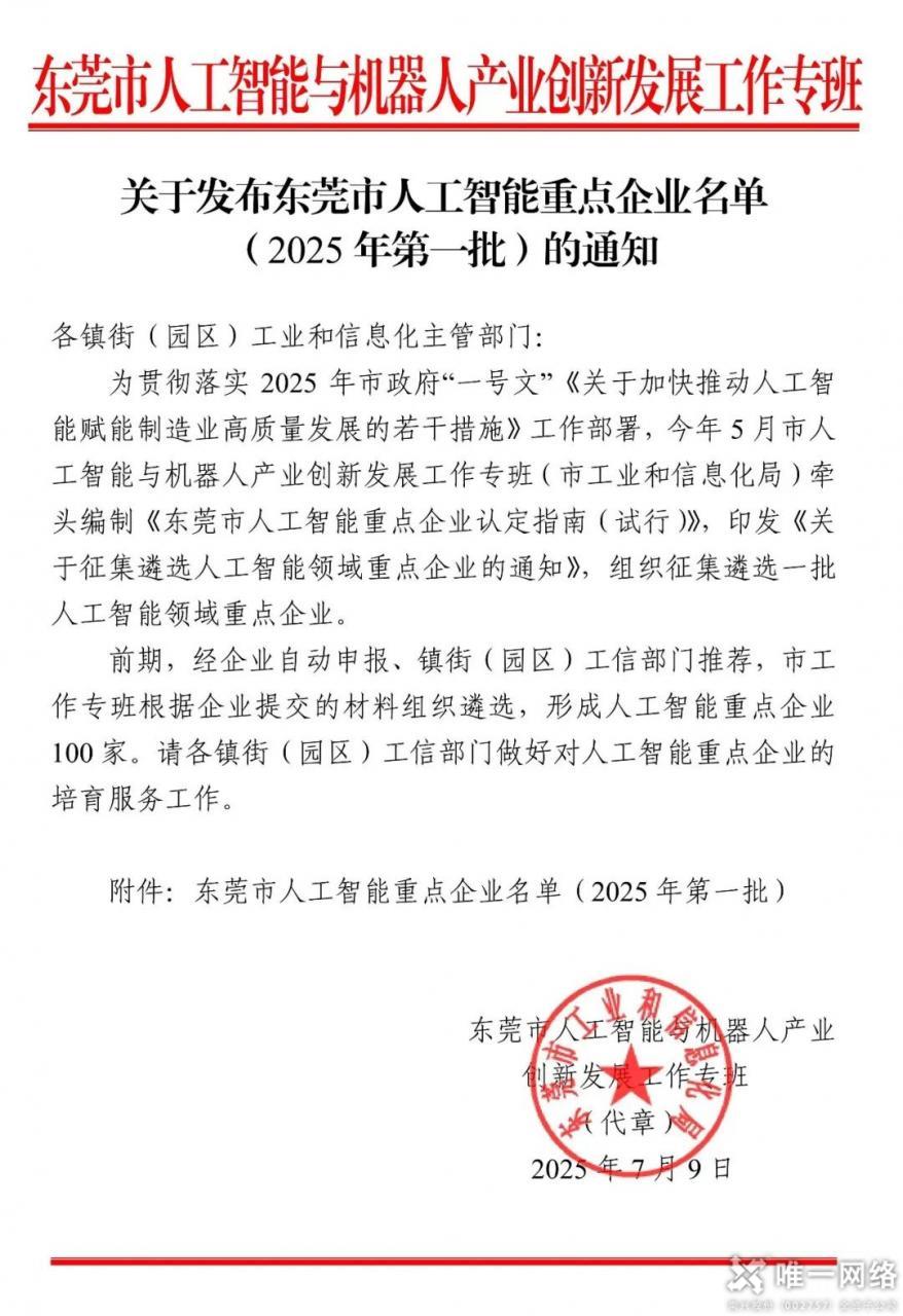 近日,東莞市人工智能與機(jī)器人產(chǎn)業(yè)創(chuàng)新發(fā)展工作專(zhuān)班正式發(fā)布《東莞市人工智能重點(diǎn)企業(yè)名單(2025 年第一批)》,唯一網(wǎng)絡(luò)憑借在人工智能領(lǐng)域的戰(zhàn)略布局、技術(shù)積淀與產(chǎn)